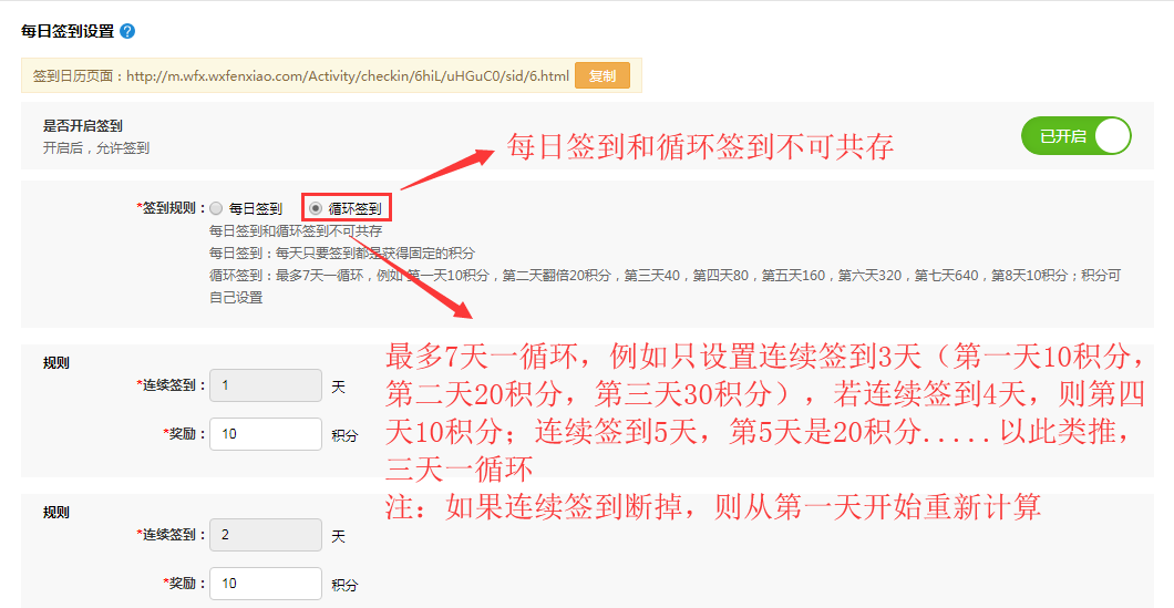 每日簽到新增“循環簽到”,可以設置連續簽到幾天送多少積分(可自己設置),最多7天一循環(例如只設置連續簽到3天,即第一天10積分,第二天20積分,第三天30積分),若連續簽到4天,則第四天10積分;連續簽到5天,第五天是20積分......以此類推,三天一循環)。注:每日簽到和循環簽到不可共存;如果連續簽到斷掉,則從第一天開始重新計算。