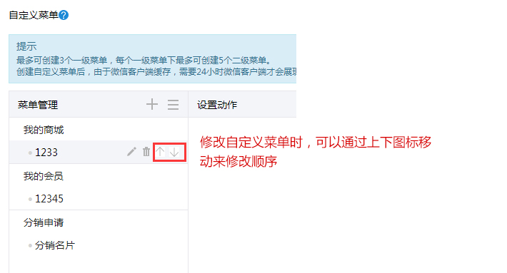 修改自定義菜單時,可以通過上下圖標移動來修改順序