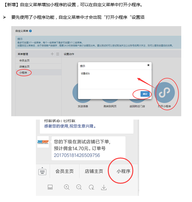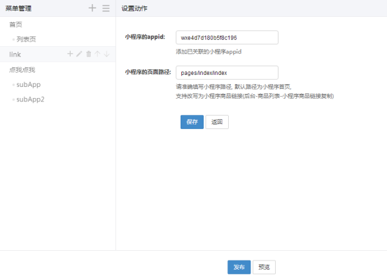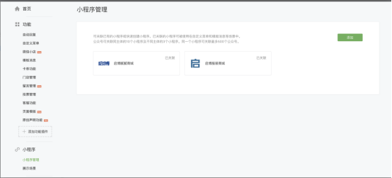 操作步驟: 總部后臺—>設置—>自定義菜單:首先要去小程序微信公眾后臺-添加管理小程序-關聯小程序,然后在微分銷后臺設置-自定義菜單中設置小程序的appid和小程序的頁面路徑,從微信公眾號里面就可以直接打開相關聯的小程序。 注意:只有關聯過公眾號的小程序才可以綁定到微分銷的自定義菜單。