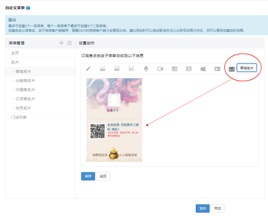 操作步驟: 總部后臺→設置→微信設置→自定義菜單:設置動作頁面增加“商城名片”后臺默認獲取的是會員名片,微信端獲取時會根據會員身份來分別獲取對應的名片,比如我是訂貨商,我微信端獲取商城名片時就會獲取到訂貨商名片。